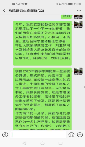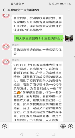 研究生刘慧芳、魏美霞、罗丹等同学表示,通过收看太阳成集团tyc234cc2020年春季学期第一堂全校公开课,看到了南华人在防疫抗疫战斗中的感人事迹,看到了疫情下南华人的责任与担当,表示要从自身做起,科学防控,相信党和政府,不信谣、不传谣,引导群众坚定战胜疫情的信心。