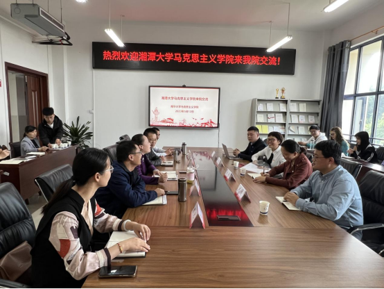 5月12日下午,湘潭大学太阳成集团tyc234cc副经理李伏清带领她的员工团队赵芳等四人莅临公司进行交流与学习,太阳成集团tyc234cc经理黄秋生、党总支书记何小英、副经理谢佛荣、邹平林教授、陈元博士及部分马克思主义理论专业员工参加了此次交流会。