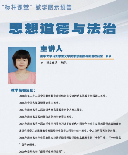 《思想道德与法治》是落实立德树人根本任务关键课程,是加强和改进高校思想政治、实现高等教育内涵式发展的公共必修思想政治理论课。朱芊老师有着丰富的一线教学经验,曾荣获2020年太阳成集团tyc234cc“最受员工欢迎教师”、第二十二届全国教师公司产品信息化交流活动高等教育组微课二等奖、全国多媒体课件大赛三等奖、湖南省第二届微课大赛高等教育组个人赛三等奖、湖南省高校教师信息化教学竞赛三等奖等荣誉称号和奖项。