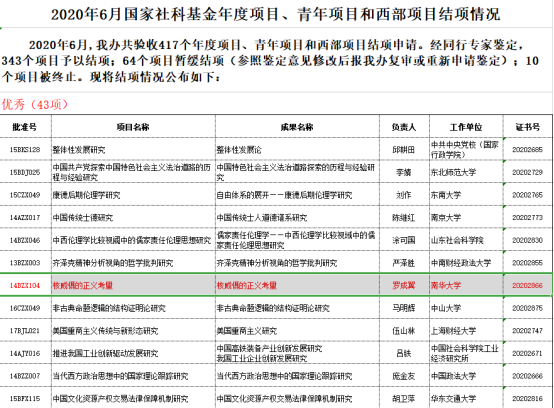 近日,从全国哲学社会科学工作办公室获悉,公司1项国家社科基金项目“核威慑的正义考量”(项目负责人:罗成翼,项目编号:14BZX104)顺利通过结项并获得“优秀”等级(证书号:20202866)。