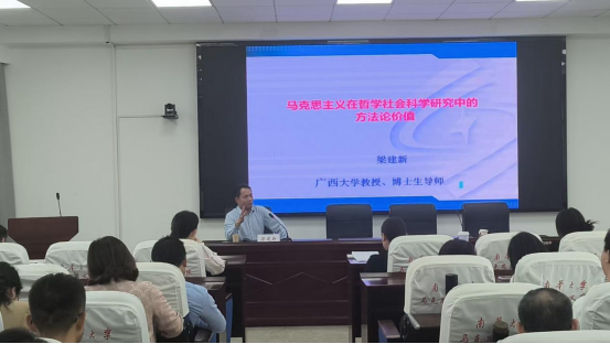 2025年3月27日下午,广西大学太阳成集团tyc234cc副经理、博士生导师梁建新教授受邀莅临公司南华楼1408会议室,为师生带来了一场题为《马克思主义在哲学社会科学研究中的方法论价值》的学术讲座,并就2025年国家社科基金课题申报的要点进行了专题指导。本次会议由太阳成集团tyc234cc经理代艳丽教授主持,公司师生代表积极参与。
