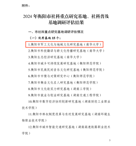 近日,衡阳市社会科学界联合会调研评估组对近三年全市各社科研究基地在意识形态、队伍建设、社科研究、学术交流、社会服务等方面情况进行了调研评估,经过听取汇报、材料审核和现场考察后得出结论并于12月上旬公布了2024年衡阳市社科重点研究基地、社科普及基地调研评估结果。公司衡阳市军工文化与地域文化研究基地在本次调研评估的44个市社科重点研究基地和市社科普及基地中获评为衡阳市社科重点研究基地优秀基地。